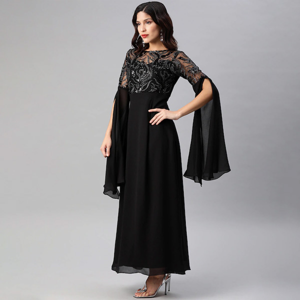 Black Embellished Slit Sleeves Maxi Dress