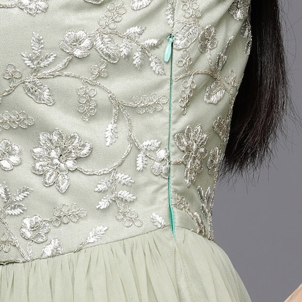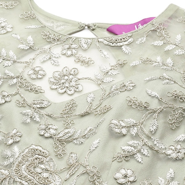 Green ethnic motifs embroidered gown dress Round neck Sleeveless Embroidered detail Maxi length in flared hem Net fabric Concealed zip closure.