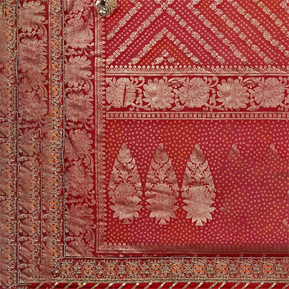Red and gold-toned bandhani saree. Woven design woven design saree with embroidered border. The saree comes with an unstitched blouse piece, The blouse worn by the model might be for modelling purpose only