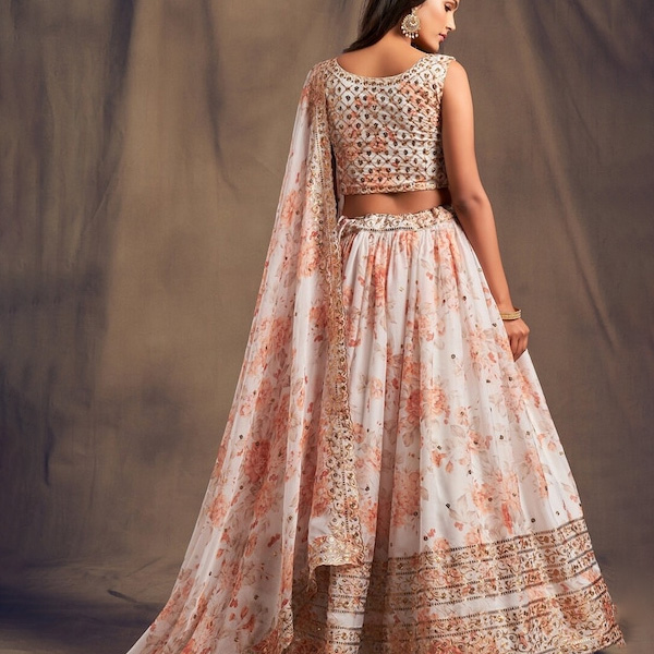 White & Beige Printed Semi-Stitched Lehenga & Unstitched Blouse With Dupatta