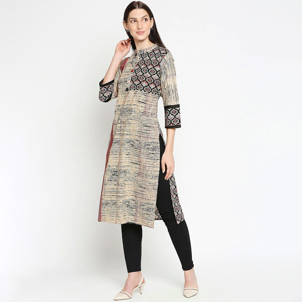 Women Beige & Black Printed Kurta