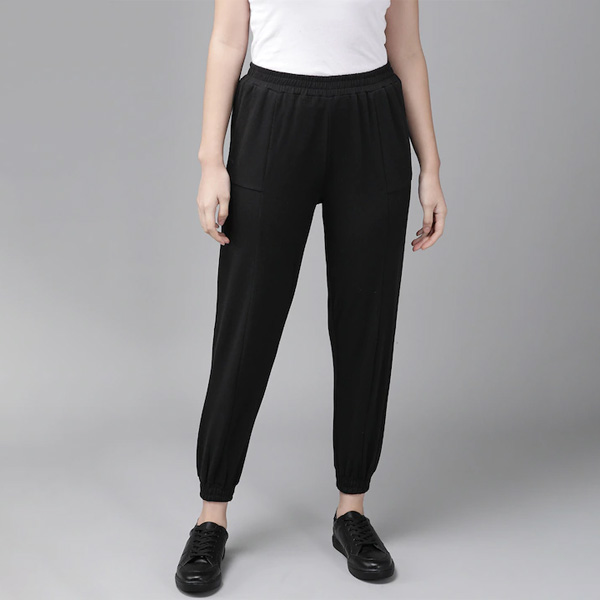 Black solid mid-rise cropped joggers, has an elasticated waistband with drawstring closure, two pockets, cuffed hem