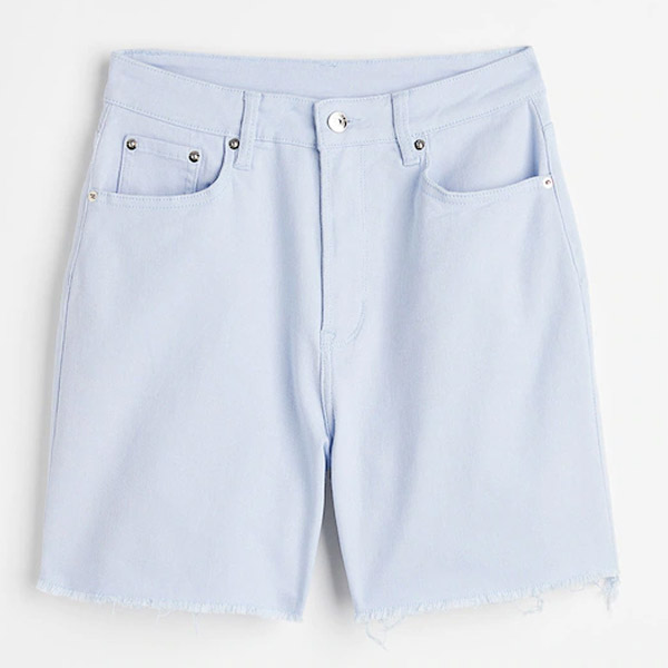 5-pocket shorts in cotton twill with a high waist, zip fly and button and raw-edge hems.