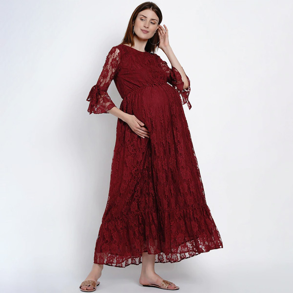 Women Maroon Maternity Self Design Maxi Dress