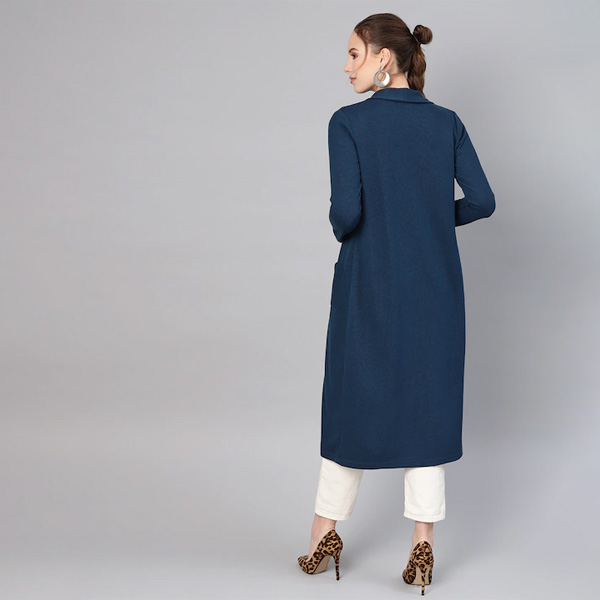 Women Teal Blue Longline Solid Open Front Winter Shrug
