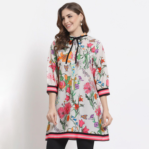 Smart Look Printed Tunic With Tie Detail At Neck. Floral Print With Border At Hem And Sleeves Cuff. Detachable Black Grosgrain Tape At Neck .